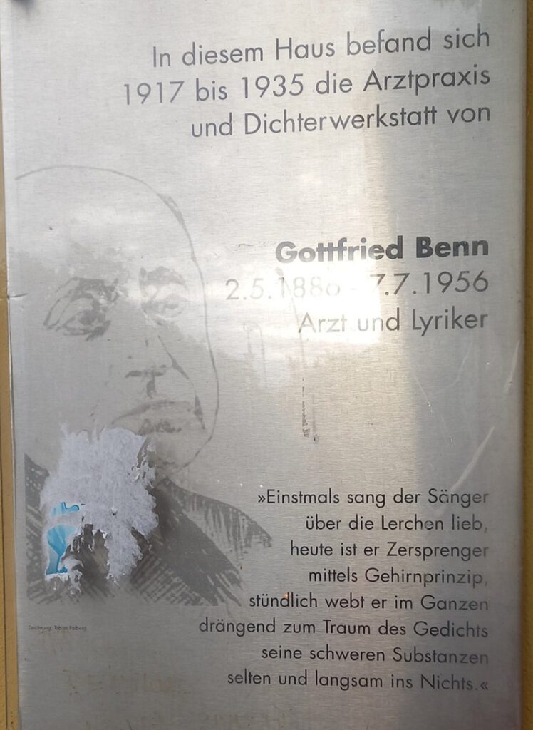 Im Umfeld unserer Möckernkiez-Genossenschaft lebten in früheren Zeiten namhafte Persönlichkeiten, an die erinnert werden sollte. Zu ihnen gehört Gottfried Benn.