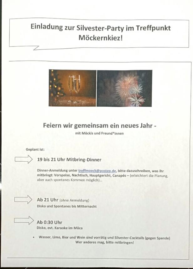 Einladung zur Silvester-Fete im Treffpunkt des Möckernkiezes.