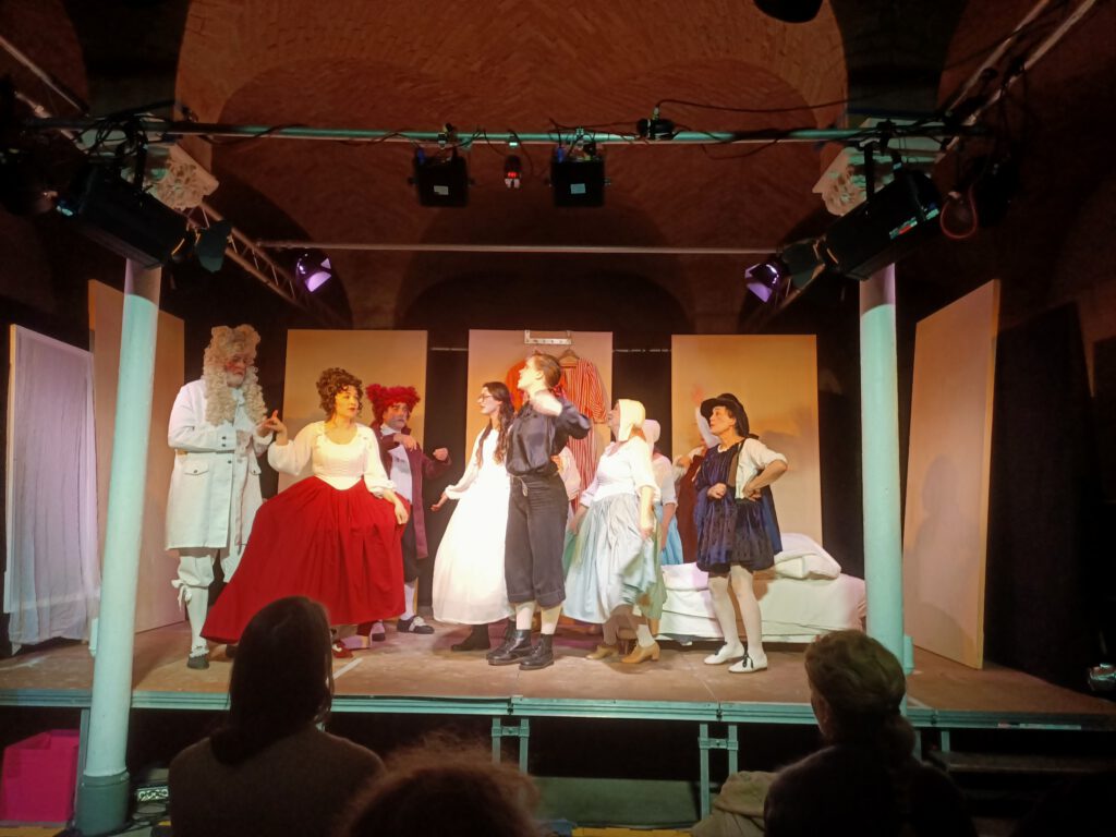 Durch die Handlung des Theaterstücks nach Beaumarchais führte Marie-Antoinette, die tote Gattin des in der französischen Revolution hingerichteten Königs Louis XVI. In Verwirrspielen selbst sehr bewandert führte sie durch das verworrene Beziehungsgeflecht am Hofe des Grafen Almaviva. Immer im Zwiegespräch mit ihrem toten Gatten, dessen Kopf sie liebevoll durch die Szenen trug, erläuterte sie, champagnertrinkend und spöttisch, dem Publikum die schrägen Gedanken des Theaterautors Beaumarchais. Mit diesem erfrischenden Regie-Einfall wurde das Publikum durch die Beziehungen geführt. Der ehemalige Barbier von Sevilla, Figaro, war inzwischen Kammerdiener des Grafen und war verlobt mit Susanna, der Kammerzofe der Gräfin und bereitete die Hochzeit mit ihr vor. Der Graf ärgerte sich inzwischen darüber, dass er so einfach die Hochzeit genehmigt hatte und war dabei sein Recht der ersten Nacht doch noch einzufordern. Das wollte nicht nur das Hochzeitspaar verhindern, auch die Gräfin und die ganze Hofschar, und schließlich wirbelte der Page Cherubino noch mal alles komplett durcheinander weil er …, alles soll nicht verraten werden. Nicht nur Marie-Antoinette spielte unglaublich cool, alle SchauspielerInnen versprühten eine unbändige Spielfreude und zeigten mit viel Witz Theater. Das Zuschauen und Dabeisein machte richtig Spaß und hinterher schien alles etwas leichter zu sein. Es gab viel und lauten Applaus.