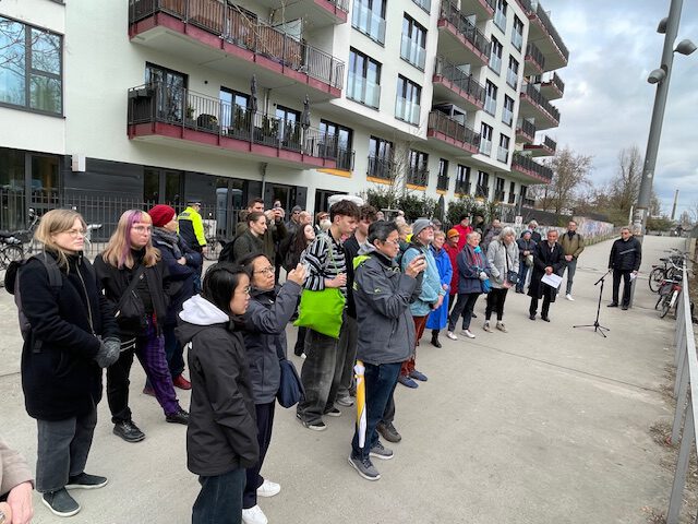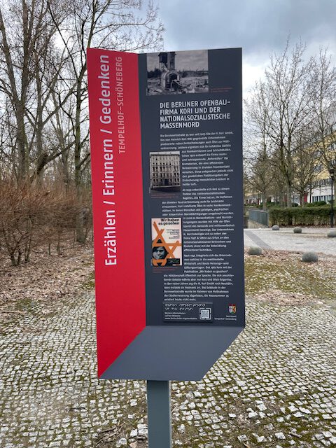 Nur wenige Meter vom ehemaligen Sitz der Firma H. Kori GmbH entfernt klärt die neue Gedenktafel darüber auf, dass das Unternehmen von 1939 bis kurz vor dem Kriegsende Verbrennungsöfen herstellte, in denen millionenfach Opfer aus den NS- Vernichtungslagern „rückstandsfrei“ beseitigt wurden. Das war für Kori ein höchst lukratives Geschäft. Dabei war allen Firmenangehörigen bekannt, für welchen Zweck die Öfen hergestellt wurden. Norbert Peters erläuterte in seiner Rede zur Enthüllung der Tafel den mehr als 50 Anwesenden aus Schöneberg und Kreuzberg den historischen Kontext.