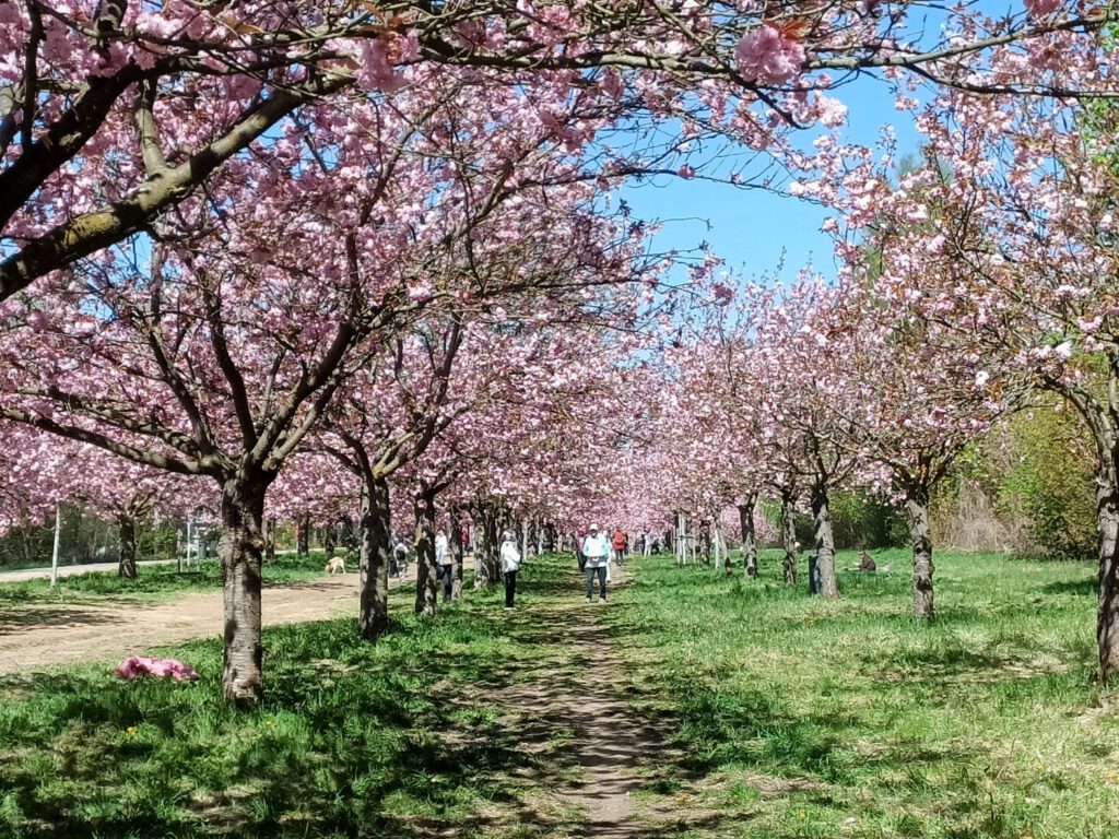 Die Blüte ist in vollem Gange, die meisten Blüten sind noch auf den Bäumen, vermutlich wird es in einer Woche dann Blüten schneien. Die Kirschblütenallee endet nicht bei den Bahngleisen, also den Mauer-Radweg weitergehen, und die Allee bis zum Ende gehen. Dort sind dann blühende Rapsfelder, auch wunderbar. Bringt zwei Stunden Zeit mit um in Ruhe rumzuwandern, picknicken geht auch.