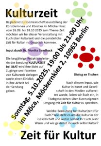 Dialog-Veranstaltung „Kulturzeit – Zeit für Kultur“ Sonntag, 5.10.2025, 19:00 bis 21:00 Uhr, im Möca, Möckernkiez 2, 10963 Berlin Begleitend zur Gemeinschaftsausstellung der Künstlerinnen und Künstler im Möckernkiez vom 26.09. bis 18.10 2025 zum Thema ZEIT möchten wir bei dieser Veranstaltung mit Euch über Kulturzeit und die persönliche Zeit für Kultur ins Gespräch kommen. Input durch …