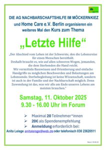 DIE AG NACHBARSCHAFTSHILFE IM MÖCKERNKIEZ und Home Care e.V. Berlin organisieren ein weiteres Mal den Kurs zum Thema „Letzte Hilfe“ „Der Abschied vom Leben ist der Schwerste, den die Lebensreise für einen Menschen bereithält.Deshalb braucht es, wie auf allen schweren Wegen, jemanden, die dem Sterbenden die Hand reicht.Wir vermitteln Basswissen und Orientierung und einfache Handgriffe …