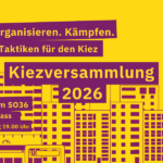 Liebe Nachbar*innen, hiermit laden wir euch zur großen Kreuzberger Kiezversammlung in 2026 ein: am Dienstag 27.01.2026, im SO36, Oranienstraße 190. Einlass ab 18.30 Uhr, Beginn 19.00 Uhr. Was tun… 💥…wenn wir durch Eigenbedarf, steigende Mieten oder Nebenkosten und Zwangsräumungen unsere Wohnung verlieren? 💥…wenn unsere Parks bebaut, unsere Freizeitorte geschlossen und umzäunt werden? …wir durch Neubau …