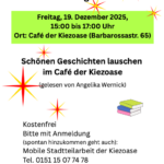 „Weihnachtslesung“, Freitag, 19.12.25, 15:00 bis 17:00 Uhr, im Café der Kiezoase, Barbarossastr. 65, nahe Goltzstr.; „schönen Geschichten lauschen …“ (gelesen von Angelika Wernick), mit Anmeldung oder spontan; Anmeldung: Jörn Brenssell, Mobile Stadtteilarbeit, Tel. 0151 15 07 74 78, E-Mail: joern.brenssell@pfh-berlin.de