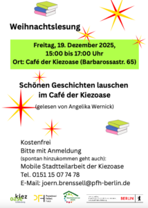 „Weihnachtslesung“, Freitag, 19.12.25, 15:00 bis 17:00 Uhr, im Café der Kiezoase, Barbarossastr. 65, nahe Goltzstr.; „schönen Geschichten lauschen …“ (gelesen von Angelika Wernick), mit Anmeldung oder spontan; Anmeldung: Jörn Brenssell, Mobile Stadtteilarbeit, Tel. 0151 15 07 74 78, E-Mail: joern.brenssell@pfh-berlin.de